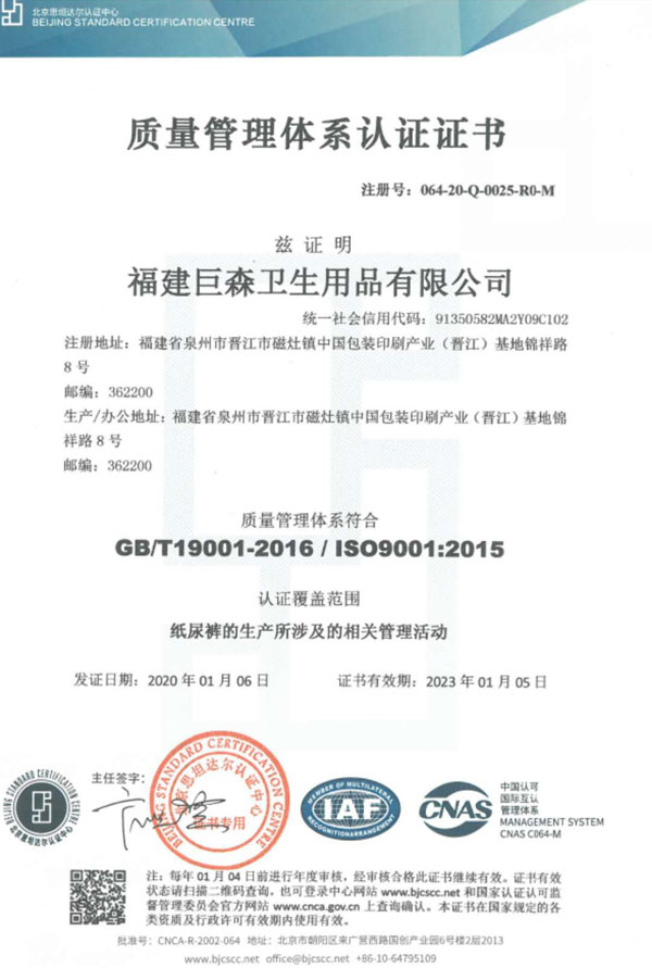 福建巨森衛(wèi)生用品有限公司于2017年初成立(原廠南昌巨森實(shí)業(yè)發(fā)展有限公司創(chuàng)立于2012年)。公司擁有一批高學(xué)歷、高素質(zhì)的管理骨干和敬業(yè)的生產(chǎn)團(tuán)隊(duì),以專業(yè)的技術(shù)、嚴(yán)謹(jǐn)?shù)墓芾、?yōu)良的設(shè)備、穩(wěn)定的貨源與強(qiáng)大的生產(chǎn)實(shí)力,為許多的客戶和代理商提供了優(yōu)質(zhì)的產(chǎn)品與服務(wù),得到了廣大客戶的信任與肯定。如今產(chǎn)品已經(jīng)覆蓋全國各地多個(gè)省、自治區(qū)、直轄市。在不斷擴(kuò)展業(yè)務(wù)的同時(shí),我們也致力于供應(yīng)鏈從源頭管控,有效地保證整個(gè)生產(chǎn)環(huán)節(jié)的安全與衛(wèi)生。2020年公司通過了ISO9001質(zhì)量體系認(rèn)證等在內(nèi)的8大國家及世界級(jí)權(quán)威機(jī)構(gòu)認(rèn)證,部分品牌還通過了醫(yī)護(hù)級(jí)產(chǎn)品認(rèn)證,產(chǎn)品質(zhì)量邁向了新的高度。品質(zhì)鑄就企業(yè),誠信鑄就實(shí)力。