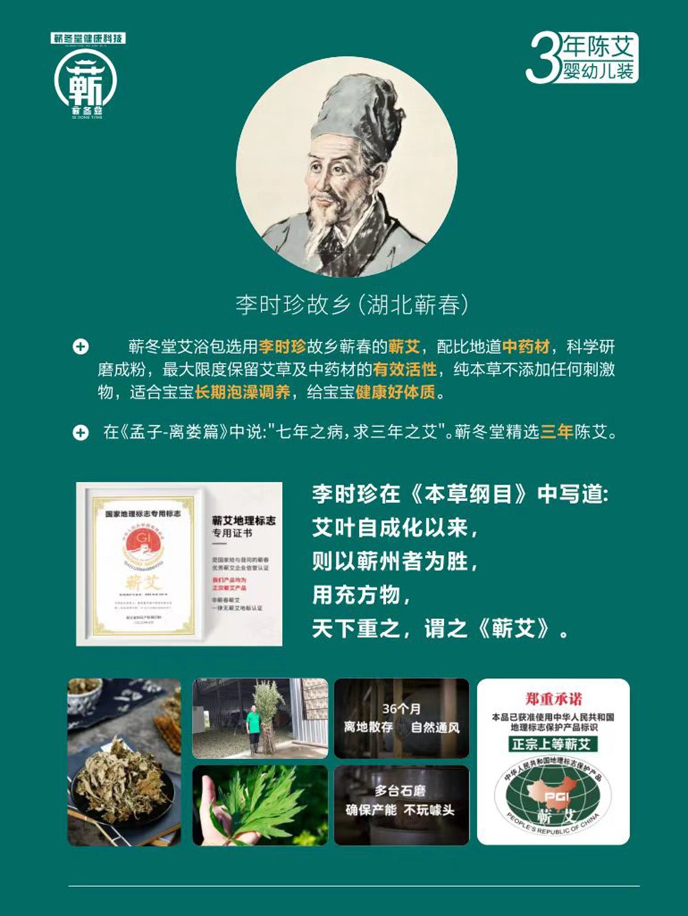 蘄冬堂艾浴包選用李時珍故鄉(xiāng)蘄春的蘄艾,配比地道中藥材,科學(xué)研磨成粉,最大限度保留艾草及中藥材的有效活性,純本草不添加任何刺激物,適合寶寶長期泡澡調(diào)養(yǎng),給寶寶健康好體質(zhì)!