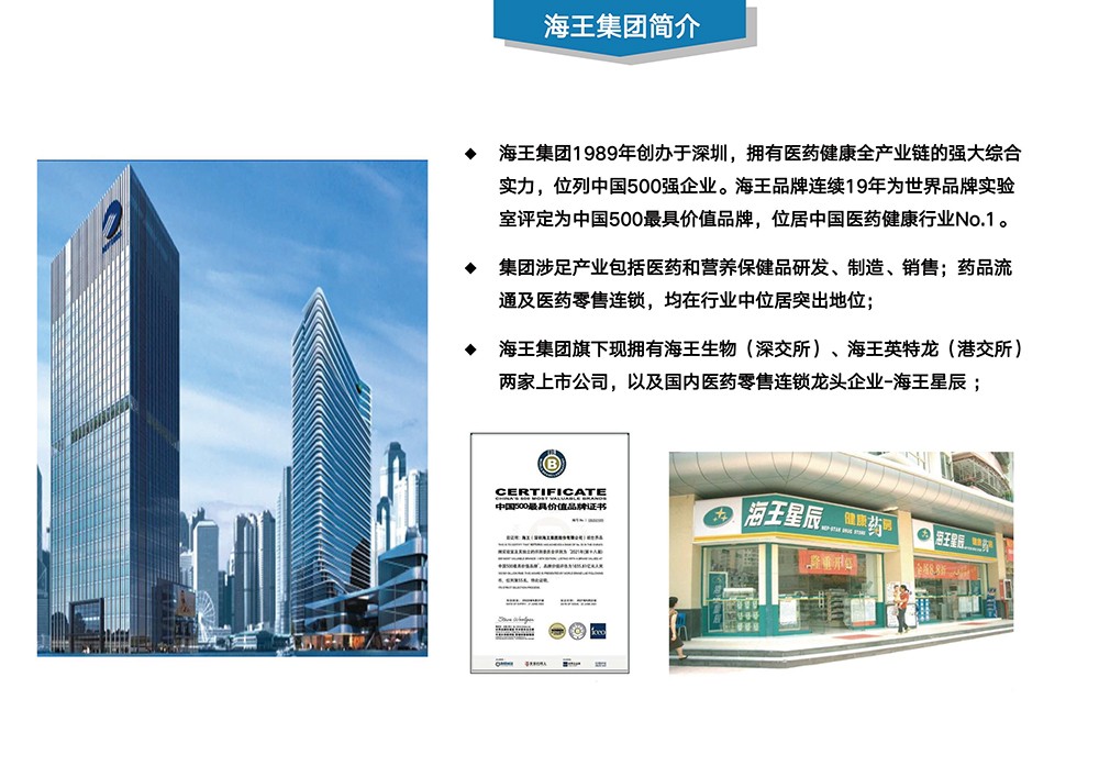 海王集團旗下現(xiàn)擁有海王生物(深交所)、海王英特龍(港交所)兩家上市公司,以及國內(nèi)醫(yī)藥零售連鎖龍頭企業(yè)-海王星辰﹔