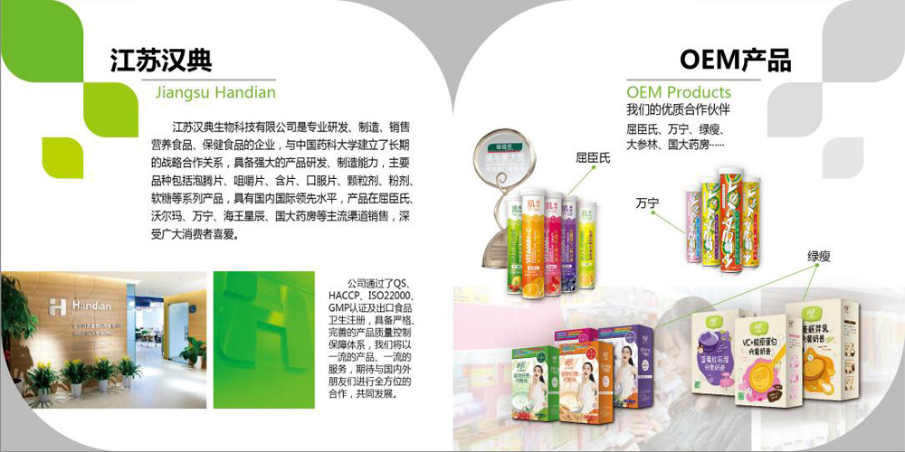 江蘇漢典生物科技股份有限公司位于六朝古都江蘇南京,是專業(yè)生產(chǎn)經(jīng)營特殊膳食營養(yǎng)食品、保健食品的專業(yè)企業(yè),目前產(chǎn)品有片劑、粉劑、膠囊、軟糖四大類五十多個品種,銷售網(wǎng)絡已經(jīng)覆蓋中國境內(nèi)的100 多個城市,在國內(nèi)大型連鎖藥店、連鎖超市均有銷售,深受廣大消費者的青睞。