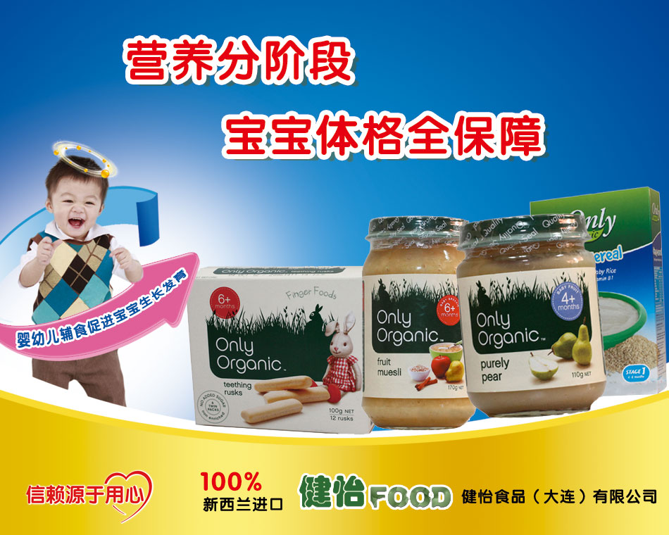 Onlyorganic(奧力)嬰幼兒有機(jī)食品,全部采用新西蘭本土新鮮的有機(jī)水果、蔬菜,經(jīng)新西蘭------有機(jī)食品體系現(xiàn)場監(jiān)督加工而成,非規(guī)模化生產(chǎn),確保各批次產(chǎn)品質(zhì)地純正、有據(jù)可查。再由先進(jìn)的工業(yè)技術(shù)封閉罐裝,暢銷于南半球各大商超,成為新西蘭、澳大利亞等地區(qū)千萬媽媽喂養(yǎng)嬰幼兒的必須產(chǎn)品。近年來Onlyorgani(奧力)產(chǎn)品已經(jīng)聲名遠(yuǎn)播,在新加坡、日本、韓國等亞太地區(qū)的發(fā)達(dá)國家已經(jīng)取得較好的銷量和口碑。