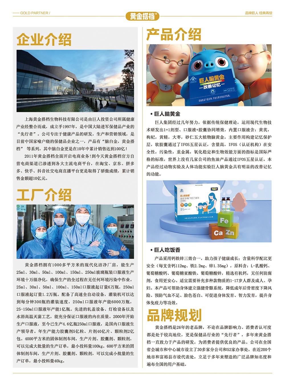 上海黃金搭檔生物科技有限公司是巨人集團旗下,由史玉柱傾心打造的一家注冊資本為1億港元的外商獨資企業(yè)。公司主導(dǎo)品牌“腦白金”、“黃金搭檔"等旺銷多年,已成為家喻戶曉的知名健康品牌,公司更是憑借產(chǎn)品協(xié)同增效的顯著特點和優(yōu)質(zhì)售后服務(wù),成為老百姓表達愛心、孝心和保健自用的信賴品牌。山東修企藥業(yè)有限公司為上海黃金搭檔生物科技有限公司授權(quán)全國母嬰渠道線下實體運營商。