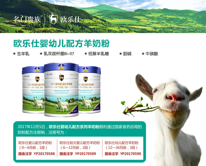 歐樂仕品牌羊奶粉即原名門貴族歐樂仕羊奶粉系列,于2017年12月份獲得國家食藥總局嬰粉注冊制審核,歐樂仕嬰幼兒羊奶粉工藝獨特,新鮮營養(yǎng),口碑極佳。
