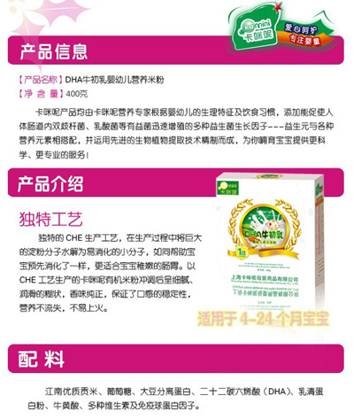 卡咪呢有機(jī)米粉系列是專為中國(guó)寶寶設(shè)計(jì)的營(yíng)養(yǎng)輔食,選用有機(jī)大米,科學(xué)搭配維生素AD等維生素,還特別添加;撬、DHA、AA等有助智力發(fā)育的營(yíng)養(yǎng)成分,富含15種營(yíng)養(yǎng)素,F(xiàn)上?ㄟ淠啬笅胗闷酚邢薰久嫦蛉珖(guó)空白市場(chǎng)區(qū)域誠(chéng)招卡咪呢有機(jī)米粉代理商。