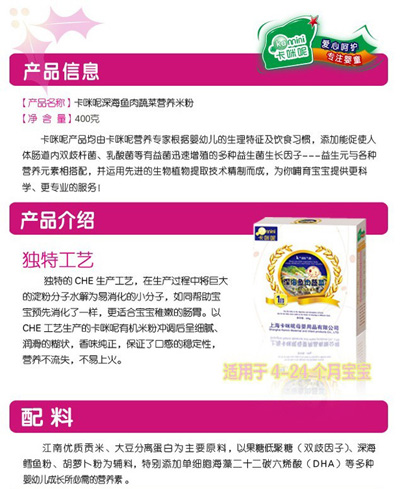 卡咪呢有機(jī)米粉系列是專為中國寶寶設(shè)計(jì)的營養(yǎng)輔食,選用有機(jī)大米,科學(xué)搭配維生素AD等維生素,還特別添加牛磺酸、DHA、AA等有助智力發(fā)育的營養(yǎng)成分,富含15種營養(yǎng)素,F(xiàn)上?ㄟ淠啬笅胗闷酚邢薰久嫦蛉珖瞻资袌鰠^(qū)域誠招卡咪呢有機(jī)米粉代理商。