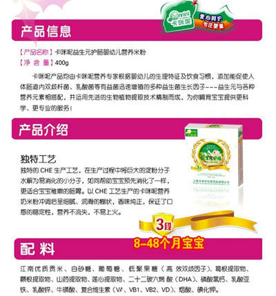卡咪呢有機(jī)米粉系列是專(zhuān)為中國(guó)寶寶設(shè)計(jì)的營(yíng)養(yǎng)輔食,選用有機(jī)大米,科學(xué)搭配維生素AD等維生素,還特別添加;撬、DHA、AA等有助智力發(fā)育的營(yíng)養(yǎng)成分,富含15種營(yíng)養(yǎng)素。現(xiàn)上?ㄟ淠啬笅胗闷酚邢薰久嫦蛉珖(guó)空白市場(chǎng)區(qū)域誠(chéng)招卡咪呢有機(jī)米粉代理商。