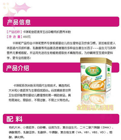 卡咪呢有機(jī)米粉系列是專為中國寶寶設(shè)計(jì)的營(yíng)養(yǎng)輔食,選用有機(jī)大米,科學(xué)搭配維生素AD等維生素,還特別添加;撬、DHA、AA等有助智力發(fā)育的營(yíng)養(yǎng)成分,富含15種營(yíng)養(yǎng)素,F(xiàn)上海卡咪呢母嬰用品有限公司面向全國空白市場(chǎng)區(qū)域誠招卡咪呢有機(jī)米粉代理商。