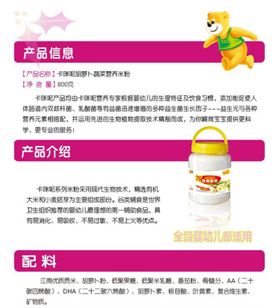 卡咪呢有機(jī)米粉系列是專為中國(guó)寶寶設(shè)計(jì)的營(yíng)養(yǎng)輔食,選用有機(jī)大米,科學(xué)搭配維生素AD等維生素,還特別添加;撬帷HA、AA等有助智力發(fā)育的營(yíng)養(yǎng)成分,富含15種營(yíng)養(yǎng)素,F(xiàn)上海卡咪呢母嬰用品有限公司面向全國(guó)空白市場(chǎng)區(qū)域誠(chéng)招卡咪呢有機(jī)米粉代理商。