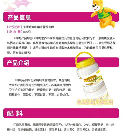 卡咪呢有機米粉系列是專為中國寶寶設(shè)計的營養(yǎng)輔食,選用有機大米,科學(xué)搭配維生素AD等維生素,還特別添加;撬帷HA、AA等有助智力發(fā)育的營養(yǎng)成分,富含15種營養(yǎng)素,F(xiàn)上海卡咪呢母嬰用品有限公司面向全國空白市場區(qū)域誠招卡咪呢有機米粉代理商。