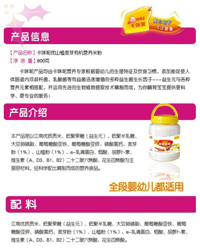 卡咪呢有機米粉系列是專為中國寶寶設計的營養(yǎng)輔食,選用有機大米,科學搭配維生素AD等維生素,還特別添加;撬、DHA、AA等有助智力發(fā)育的營養(yǎng)成分,富含15種營養(yǎng)素。現(xiàn)上?ㄟ淠啬笅胗闷酚邢薰久嫦蛉珖瞻资袌鰠^(qū)域誠招卡咪呢有機米粉代理商。