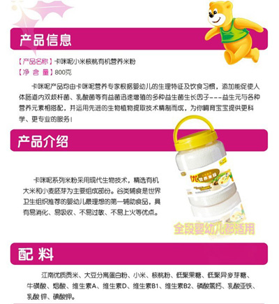 卡咪呢有機(jī)米粉系列是專為中國(guó)寶寶設(shè)計(jì)的營(yíng)養(yǎng)輔食,選用有機(jī)大米,科學(xué)搭配維生素AD等維生素,還特別添加;撬、DHA、AA等有助智力發(fā)育的營(yíng)養(yǎng)成分,富含15種營(yíng)養(yǎng)素,F(xiàn)上海卡咪呢母嬰用品有限公司面向全國(guó)空白市場(chǎng)區(qū)域誠(chéng)招卡咪呢有機(jī)米粉代理商。