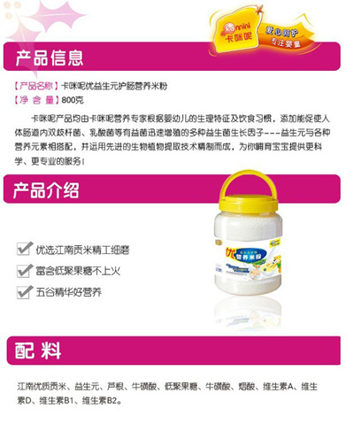 卡咪呢乳清蛋白嬰幼兒營養(yǎng)米粉是上?ㄟ淠啬笅胗闷酚邢薰酒煜庐a(chǎn)品,精選優(yōu)質(zhì)大米制作,特別添加乳清蛋白和益生元,提高寶寶抵抗力,促進(jìn)寶寶changdao的消化吸收,上市以來廣受父母消費(fèi)者的青睞。