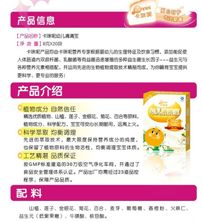卡咪呢小兒板藍(lán)根顆粒是上?ㄟ淠啬笅胗闷酚邢薰酒煜庐a(chǎn)品,專為嬰幼兒設(shè)計(jì),專業(yè)、安全,幫助寶寶可以預(yù)防感冒抵抗病毒,是廣大父母育兒的好幫手。卡咪呢小兒板藍(lán)根顆粒不含任何色素、防腐劑,安全放心。