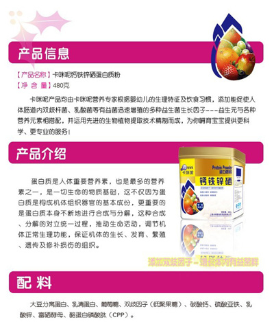 蛋白質(zhì)是人體重要營(yíng)養(yǎng)素,也是多的營(yíng)養(yǎng)素之一,是一切生命的物質(zhì)基礎(chǔ),可以保證機(jī)體的生長(zhǎng)、發(fā)育、繁殖、遺傳及修補(bǔ)損傷的組織。上海卡咪呢母嬰用品有限公司是專業(yè)的母嬰營(yíng)養(yǎng)品企業(yè),針對(duì)中國(guó)孕嬰童體質(zhì)推出了卡咪呢蛋白質(zhì)粉系列產(chǎn)品,現(xiàn)面向全國(guó)招商。