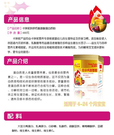 蛋白質(zhì)是人體重要營養(yǎng)素,也是多的營養(yǎng)素之一,是一切生命的物質(zhì)基礎(chǔ),可以保證機(jī)體的生長、發(fā)育、繁殖、遺傳及修補(bǔ)損傷的組織。上海卡咪呢母嬰用品有限公司是專業(yè)的母嬰營養(yǎng)品企業(yè),針對中國孕嬰童體質(zhì)推出了卡咪呢蛋白質(zhì)粉系列產(chǎn)品,現(xiàn)面向全國招商。