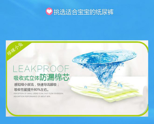 柔薄芯層結(jié)構(gòu),采用全芯高科技結(jié)構(gòu)設(shè)計(jì)、薄軟透氣、零接觸摩擦感、不起坨、不斷層、輕輕的呵護(hù),給寶寶體貼的愛。綿柔無紡布透氣底膜,及時(shí)散發(fā)悶熱濕氣,減少寶寶皮膚的刺激及傷害。全新3D打孔大珍珠面層,瞬間吸收,加倍干爽,連通吸收芯成(多層鎖水)系統(tǒng),有效吸收和鎖住更多尿液,讓寶寶屁屁更加干爽。雙重防漏立體設(shè)計(jì),舒適柔軟貼合腿部,防止尿尿往兩邊側(cè)漏,給寶寶自由自在,盡情活動的舒爽空間。人性化合身曲線剪裁,專為中國寶寶設(shè)計(jì)的合身檔剪裁,更加貼合寶寶,腿部及臀部曲線,減少腿部摩擦與壓力。背部彈性腰圍貼身防后漏,無論寶寶坐、騎、爬等,大環(huán)腰彈性腰圍能自然伸縮,貼身服帖。