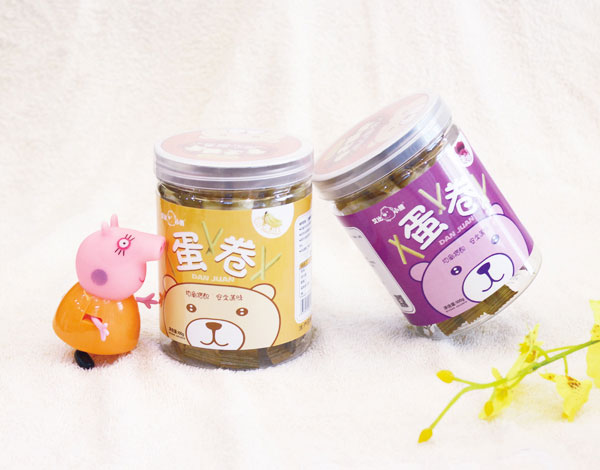艾比小熊蛋卷系列共包含5種口味,紫薯、椰奶、香蕉、海苔、草莓;精選面粉,含礦物質(zhì)、無機鹽、蛋白質(zhì),加入雞蛋液、各種果蔬汁、奶汁、海苔碎片等,經(jīng)成糊、成卷、涂抹植物油烤焙而得,蛋卷色澤金黃偏向其中所加
