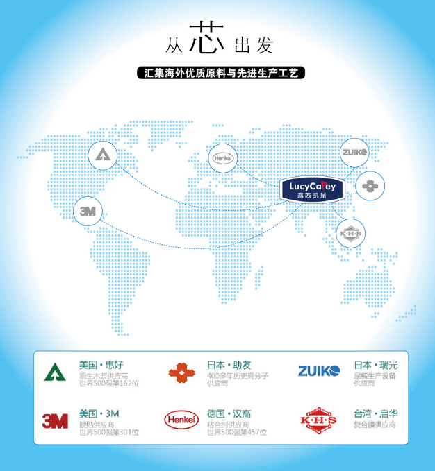 LUCYCAREY露茜凱瑞紙尿褲選用全球頂尖供應(yīng)商的紙尿褲原材料:住友、三大雅高分子吸水材料;美國3M魔術(shù)貼;德國萊卡松緊帶;美國進口原生木漿;德國漢高粘合劑;美國、日本進口無紡布;進口超柔軟透氣底膜等。另外,全世界zui先進的全自動紙尿褲生產(chǎn)線,年產(chǎn)銷數(shù)億片紙尿褲的成熟的生產(chǎn)制造團隊,確保產(chǎn)品高品質(zhì)。