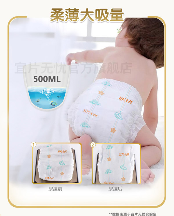 宜片無憂童趣紙尿褲采用熱風材質(zhì),親膚柔軟,選用柔軟熱風凸點無紡布作為面料,具有蓬松度高,彈性好,手感柔軟,透氣性好等特點,寶寶穿著舒適,玩的開心,睡得安心。