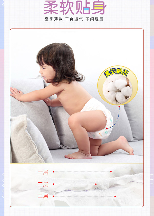 宜片無憂童趣紙尿褲采用熱風(fēng)材質(zhì),親膚柔軟,選用柔軟熱風(fēng)凸點無紡布作為面料,具有蓬松度高,彈性好,手感柔軟,透氣性好等特點,寶寶穿著舒適,玩的開心,睡得安心。
