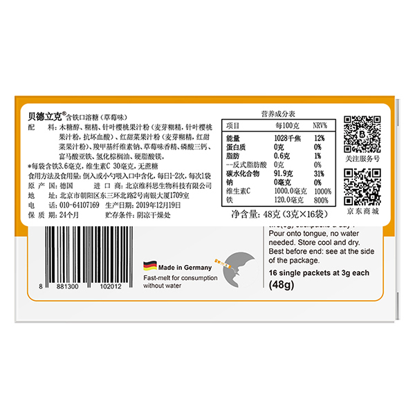 配料成分:山梨糖醇,針葉櫻桃果汁粉,紅甜菜果汁粉,羧甲基纖維素鈉,櫻桃香精,磷酸三鈣,富馬酸亞鐵,清華棕櫚油,硬脂酸鎂。