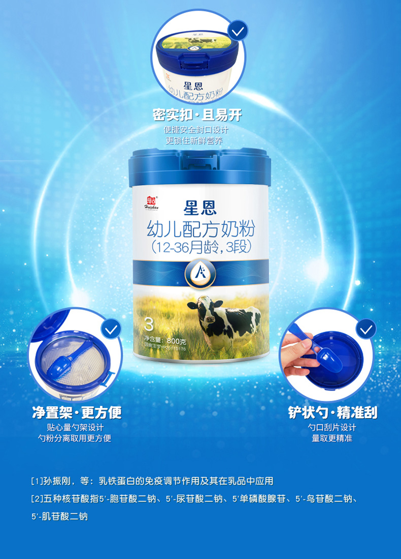 輝山星恩嬰兒奶粉,精選奶源,源頭把控,工藝鎖留,確保奶粉新鮮品質(zhì)。生牛乳入料,并添加了DHA、ARA、益生元、;撬岬,科學(xué)配比,滿足成長階段的營養(yǎng)需求。奶香純正,口感細(xì)膩,易消化,好吸收。