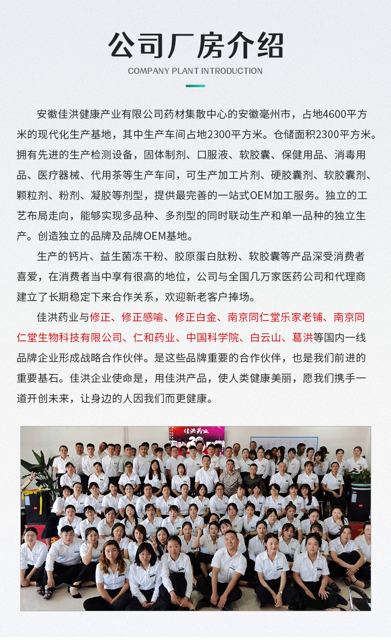 安徽佳洪健康產(chǎn)業(yè)有限公司位于全球最大的中藥材集散中心安徽亳州市,占地4600平方的現(xiàn)代化生產(chǎn)基地,其中生產(chǎn)車間占地2300平。倉儲面積2300平。國際先進(jìn)的生產(chǎn)檢測設(shè)備,固體制劑、口服液、軟膠囊、保健用品、消毒用品、醫(yī)療器械、代用茶等生產(chǎn)車間,可生產(chǎn)加工片劑、硬膠囊劑、軟膠囊劑、顆粒劑、粉劑、凝膠等劑型,提供最完善的一站式OEM加工服務(wù)。獨(dú)立的工藝布局走向,能夠?qū)崿F(xiàn)多品種、多劑型的同時(shí)聯(lián)動生產(chǎn)和單一品種的獨(dú)立生產(chǎn)。創(chuàng)造獨(dú)立的品牌及品牌OEM基地。