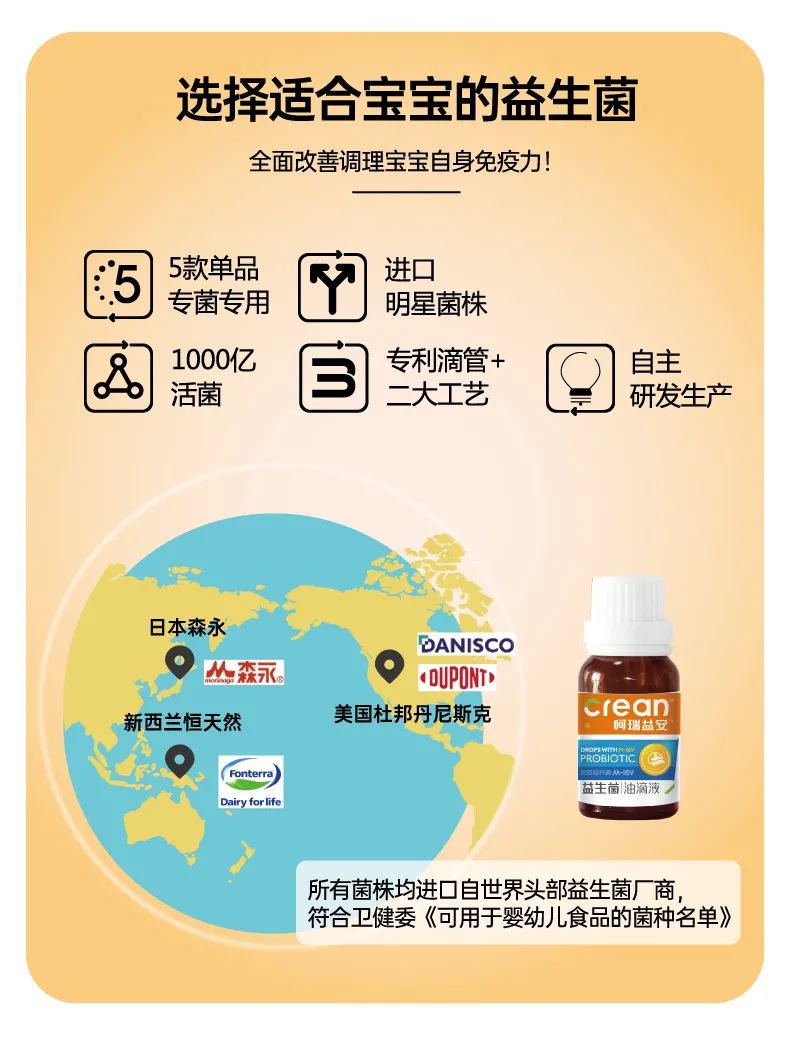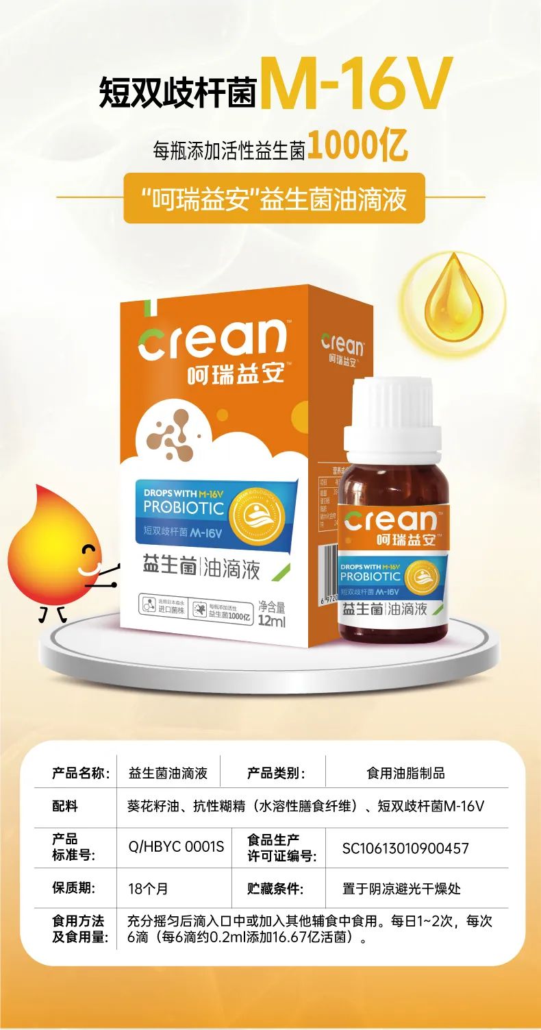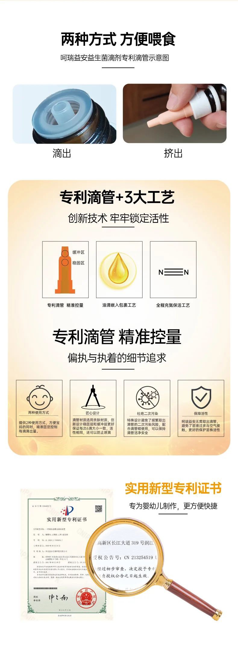 呵瑞益安短雙歧桿菌M-16V益生菌油滴液,采用進(jìn)口菌株,且選用菌株符合衛(wèi)健委【可用于嬰幼兒食品的菌種名單】。添加進(jìn)口原料,如瑞典AAK進(jìn)口油脂及進(jìn)口水溶性膳食纖維,安全配方,自主研發(fā)生產(chǎn),每瓶添加1000億活性益生菌,專利滴管,精準(zhǔn)控量,油滴嵌入包裹工藝+全程充氮;罟に,牢牢鎖定活性。
