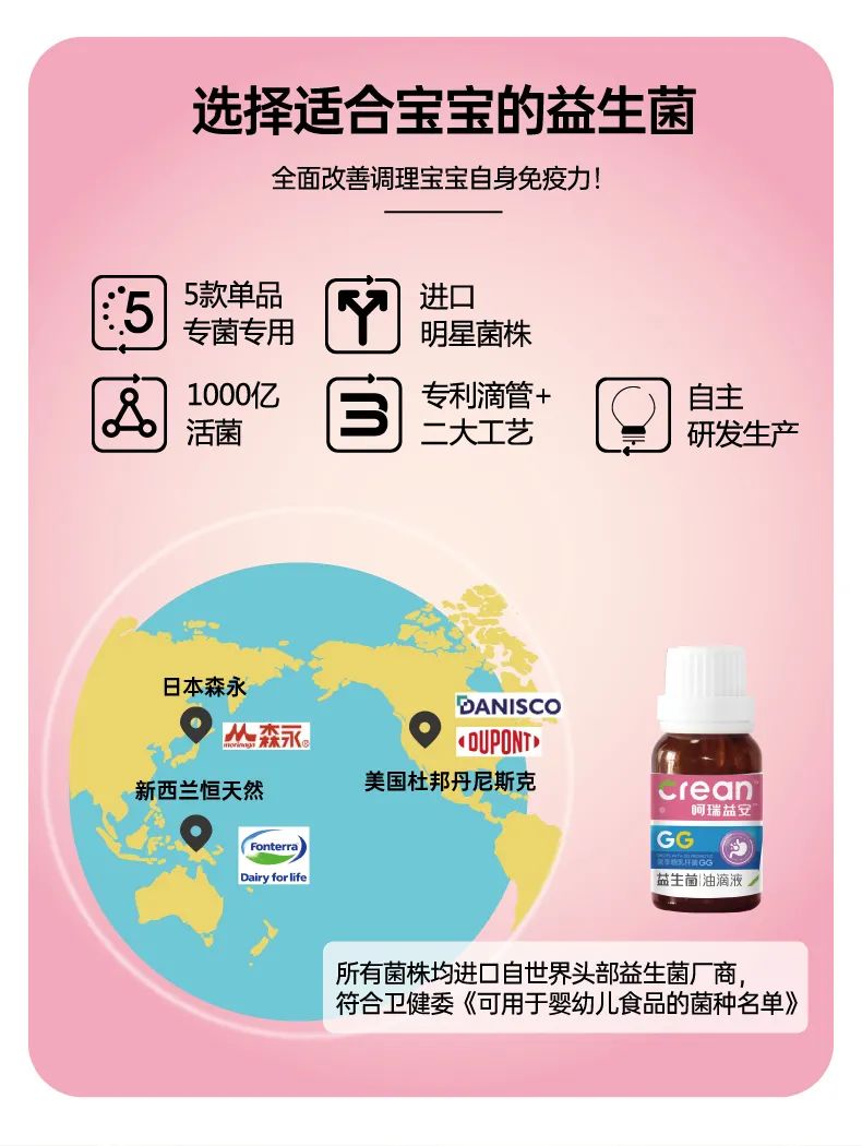 呵瑞益安鼠李糖乳桿菌GG益生菌油滴液,采用進(jìn)口菌株,且選用菌株符合衛(wèi)健委【可用于嬰幼兒食品的菌種名單】。添加進(jìn)口原料,如瑞典AAK進(jìn)口油脂及進(jìn)口水溶性膳食纖維,安全配方,自主研發(fā)生產(chǎn),每瓶添加1000億活性益生菌,專利滴管,精準(zhǔn)控量,油滴嵌入包裹工藝+全程充氮;罟に,牢牢鎖定活性。