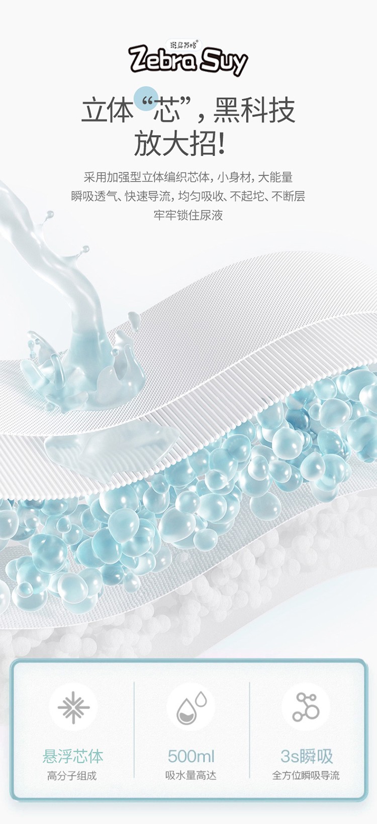 斑馬蘇怡紙尿褲/拉拉褲,大環(huán)腰加高護(hù)圍,加寬腰圍設(shè)計(jì),柔軟有彈性,貼合身形不勒肚肚;輕柔蓬松3D熱風(fēng)立體棉層雙倍親膚的柔軟,如云觸感,宛若初生;薄約0.1cm輕薄芯,薄如一枚硬幣,小PP沒(méi)負(fù)擔(dān);立體“芯”,不止于薄還超能吸,增加前后吸水面積,容納寶寶大尿量;360°環(huán)抱寶寶小腰身,配合3D立體剪裁,動(dòng)感貼合寶寶曲線,隨心所動(dòng);采用加強(qiáng)型立體編織芯體,內(nèi)含魔力縮水珠,瞬吸透氣,快速導(dǎo)流,均勻吸收,不起坨、不斷層,牢牢鎖住尿液;雙層5cm加高防漏側(cè)擋,隨心動(dòng);靈敏智能尿顯,變色快,勤更換,給寶寶看得見(jiàn)的安心呵護(hù)。