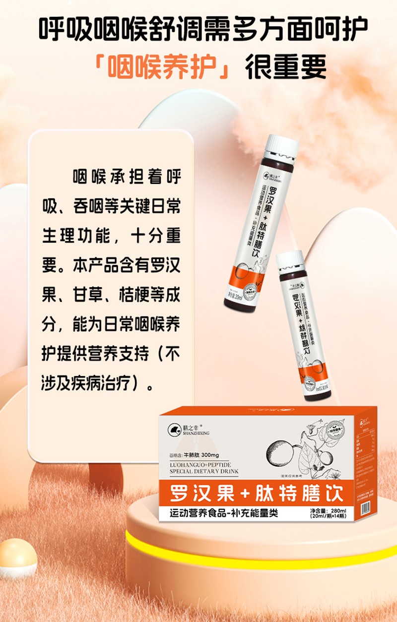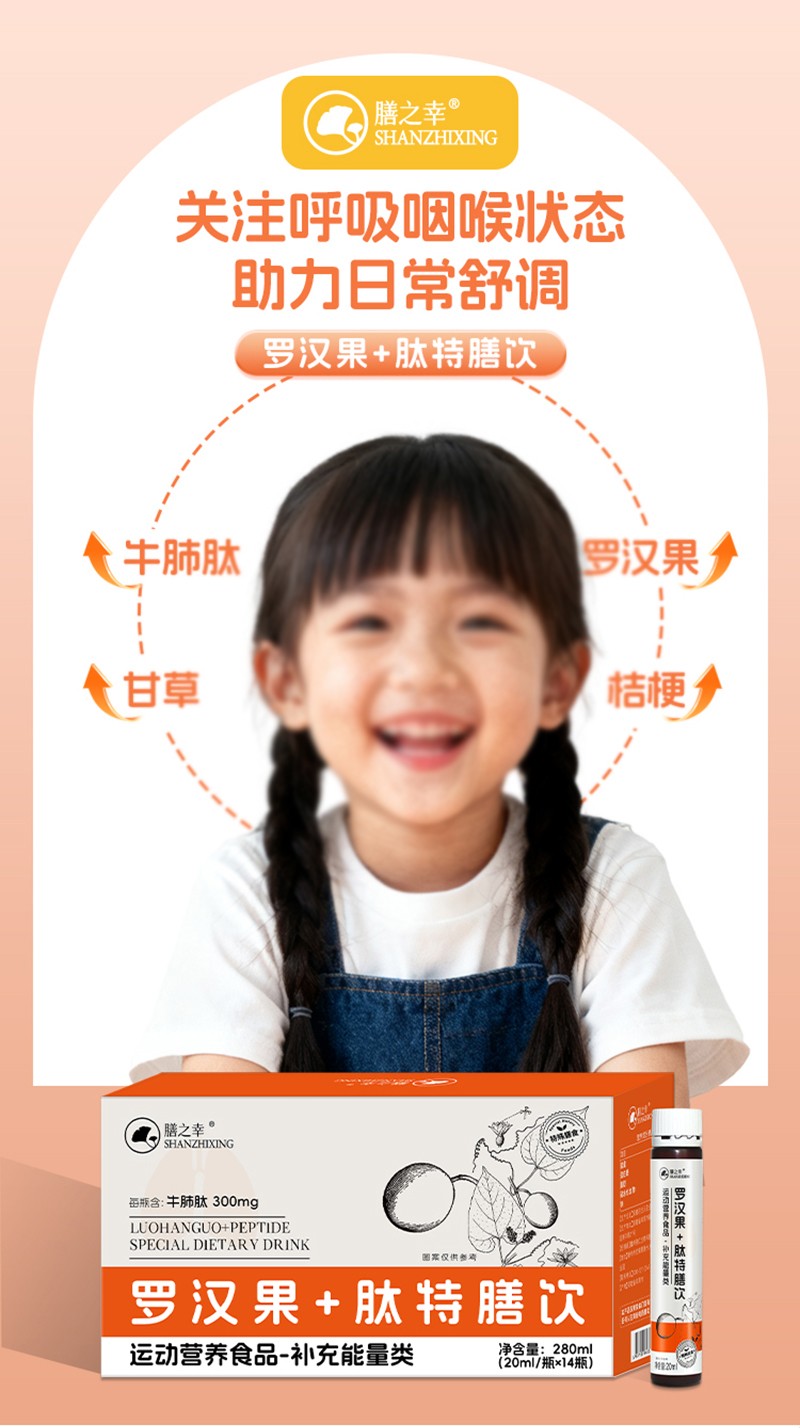 【配料表】水、木糖醇、羅漢果(10%)、甘草(8%)、桔梗(8%)、牛肺肽(300mg/瓶)、蜂蜜、百合、紫蘇、桑葉、山楂、茯苓、橘皮、甜菊糖苷、檸檬酸、檸檬酸鈉、山梨酸鉀