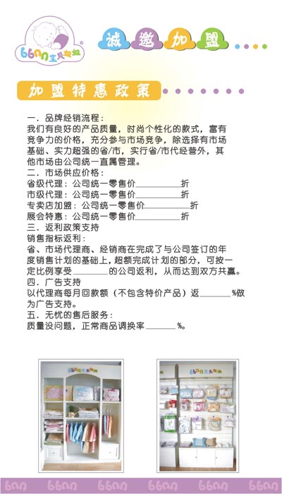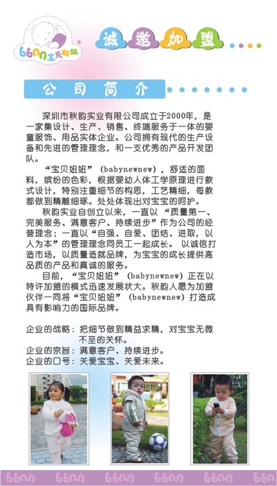 目前,“寶貝妞妞”(babynewnew)正在以特許加盟的模式迅速發(fā)展?fàn)畲。秋韻人愿為加盟伙伴一同將“寶貝妞妞”(babynewnew)打造成具有影響力的國際品牌。