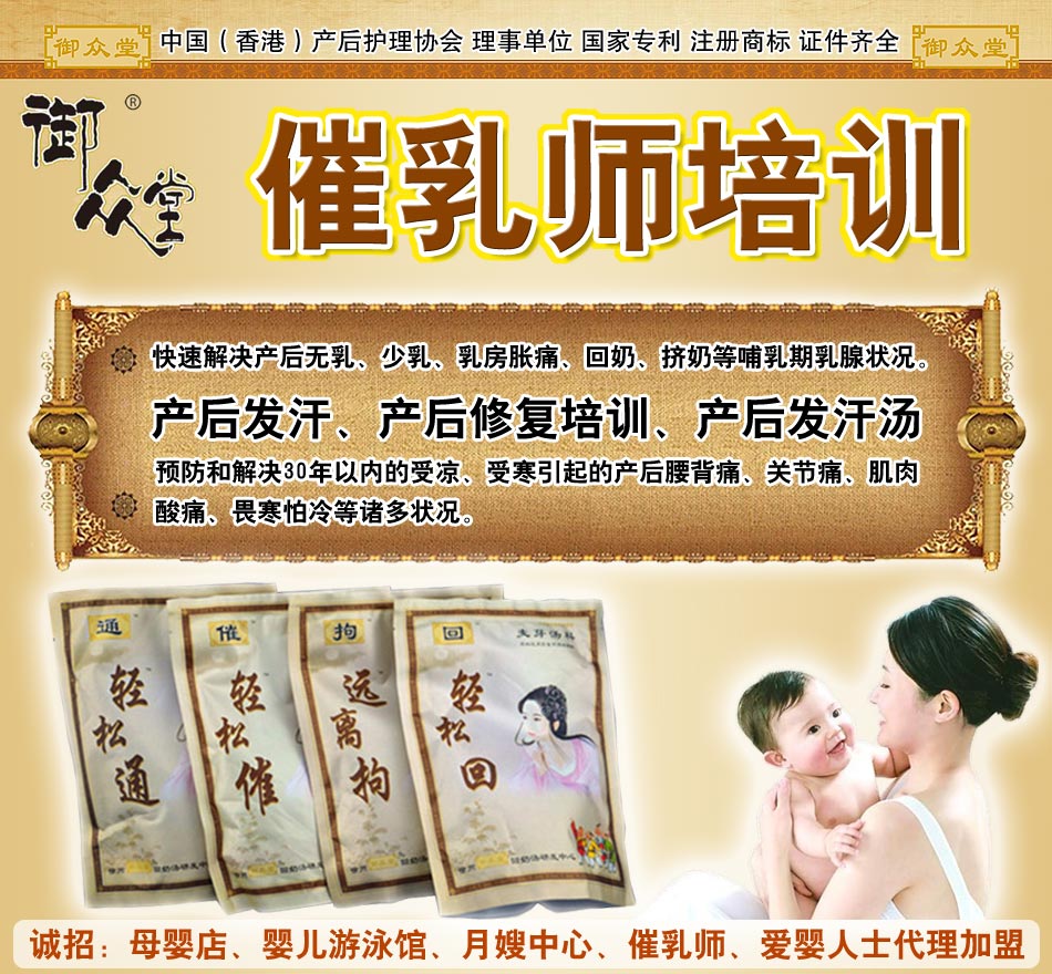 御眾堂創(chuàng)始人許瓊女士,出生于中醫(yī)世家,在祖?zhèn)髅胤降幕A上,廣求名醫(yī)及眾家所長結合豐富的臨床經驗,總結整理出一套根據產婦的不同情況按需無痛推拿按摩配合湯劑條理的解決哺乳期乳腺狀況的技術方法,并成功研發(fā)出催奶湯、通奶湯、拘奶湯和回奶湯系列產品,做到了標本兼治,療效可達100%,現已申請國家專利。