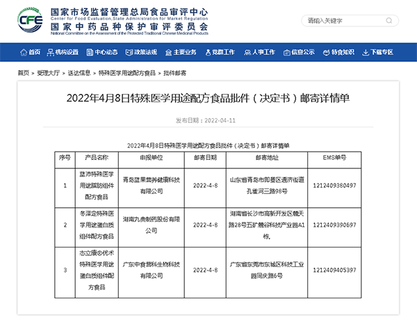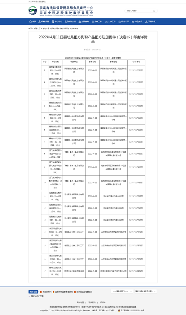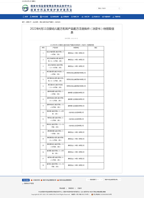2022年4月11日,國家市場監(jiān)督管理總局食品審評中心發(fā)布嬰幼兒配方乳粉產(chǎn)品配方注冊批件(決定書)待領(lǐng)取信息和郵寄詳情單,涉及35款產(chǎn)品;特殊醫(yī)學(xué)用途配方食品批件(決定書)郵寄詳情單也披露了3款產(chǎn)品,詳情如下: