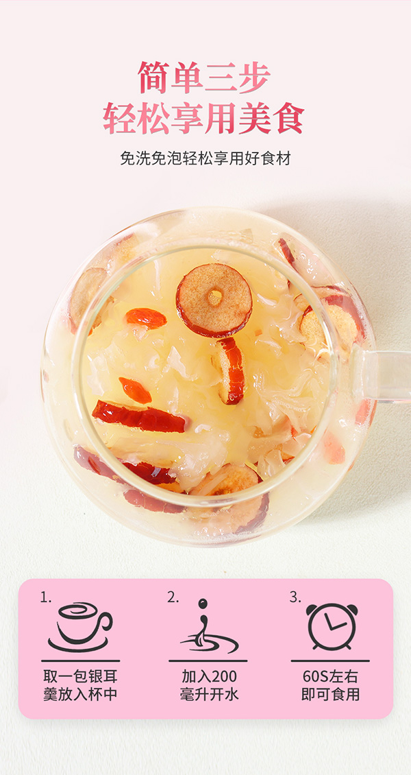 配料:鮮銀耳、冰糖、紅棗、枸杞、燕窩