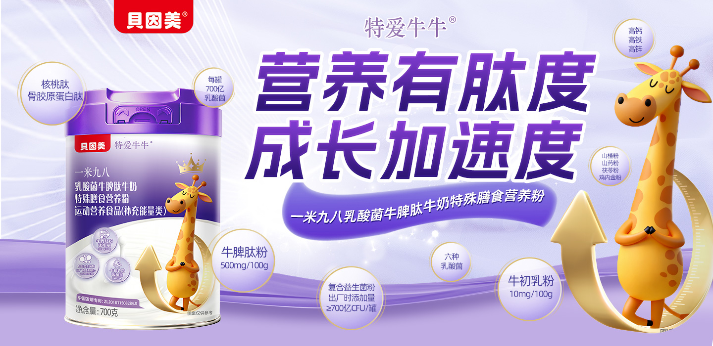 貝因美特愛(ài)牛牛一米九八乳酸菌牛脾肽牛奶特殊膳食營(yíng)養(yǎng)粉,中國(guó)發(fā)明專(zhuān)利:ZL201811503284.0,安全放心!每100添加牛脾肽粉500mg,牛初乳粉10mg,復(fù)合益生菌粉出廠時(shí)添加量≥700億CFU/罐,科學(xué)配方,優(yōu)質(zhì)營(yíng)養(yǎng)!專(zhuān)為3-15歲兒童骨骼生長(zhǎng)黃金期設(shè)計(jì),營(yíng)養(yǎng)有肽度,成長(zhǎng)加速度!