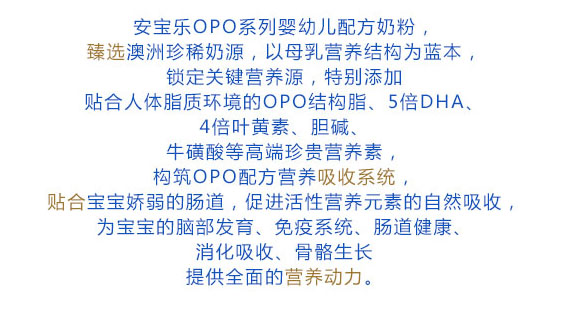 安寶樂(lè)獲得國(guó)際HACCP和ISO9001食品質(zhì)量管理體系雙重認(rèn)證,嚴(yán)格按照國(guó)際GMP制藥級(jí)標(biāo)準(zhǔn)生產(chǎn),主要原料來(lái)自南緯37度世界黃金奶源地維多利亞阿爾卑斯山脈有機(jī)牧場(chǎng)的新鮮牛奶,不含農(nóng)藥殺蟲(chóng)劑、人工激素、抗生素、農(nóng)藥化肥殘留及轉(zhuǎn)基因物質(zhì),采用國(guó)際領(lǐng)先濕混工藝,結(jié)合安寶樂(lè)獨(dú)特的五元臻護(hù)配方,配制出的營(yíng)養(yǎng)均衡、易消化、易吸收的高品質(zhì)奶粉。