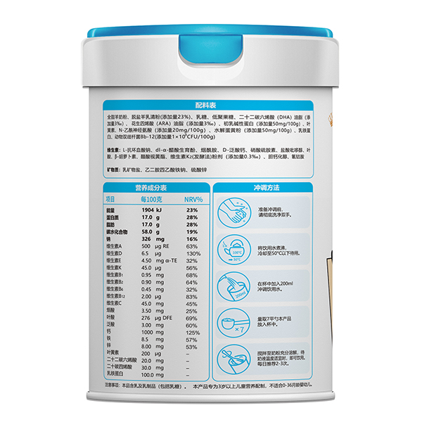 慧滋小狀元兒童成長配方羊奶粉,甄選奶源,嚴(yán)選產(chǎn)地,采用先進(jìn)自動化生產(chǎn)設(shè)備,產(chǎn)品經(jīng)過嚴(yán)格檢驗,多重保障,品質(zhì)放心。根據(jù)成長階段營養(yǎng)需求科學(xué)配比多重營養(yǎng)素,每100g中含脫鹽羊乳清粉23g、乳鐵蛋白100mg、水解蛋黃粉50mg、初乳堿性蛋白50mg,更添加動物雙歧桿菌Bb-12、益生元、葉黃素、DHA&ARA、N-乙酰神經(jīng)氨酸,以及多種維生素與礦物質(zhì)等微量元素,合理配比,營養(yǎng)美味,奶香濃郁,親和好吸收,給力護(hù)成長。