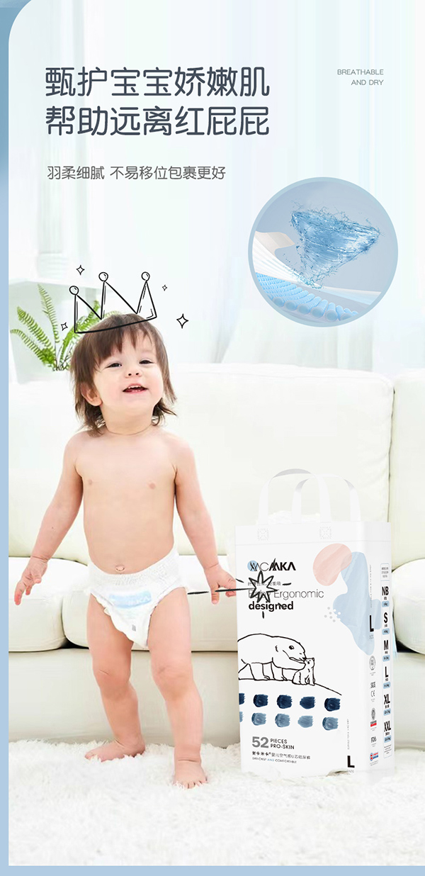 麥卡米卡嬰兒空氣感U芯紙尿褲,醫(yī)護(hù)級紙尿褲,多國檢測認(rèn)證。羽毛般輕薄,薄至0.1cm,無感般穿著,透氣舒適,自有呼吸不悶熱;臺灣進(jìn)口面層,梅花打孔設(shè)計(jì),先進(jìn)單層水刺布技術(shù),更輕薄,更柔軟親膚,讓寶寶的小屁屁更干爽,更舒服。日本進(jìn)口芯體,不易起坨斷層,自主獨(dú)特吸水系統(tǒng),海量瞬吸;全方位立體打孔,底膜25000個透氣孔,迅速散熱排濕,甄護(hù)寶寶嬌嫩肌膚,遠(yuǎn)離紅屁屁;羽柔細(xì)膩,不易移位,包裹更好;雙層防側(cè)漏,安睡一整晚。