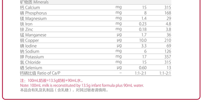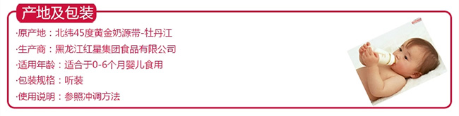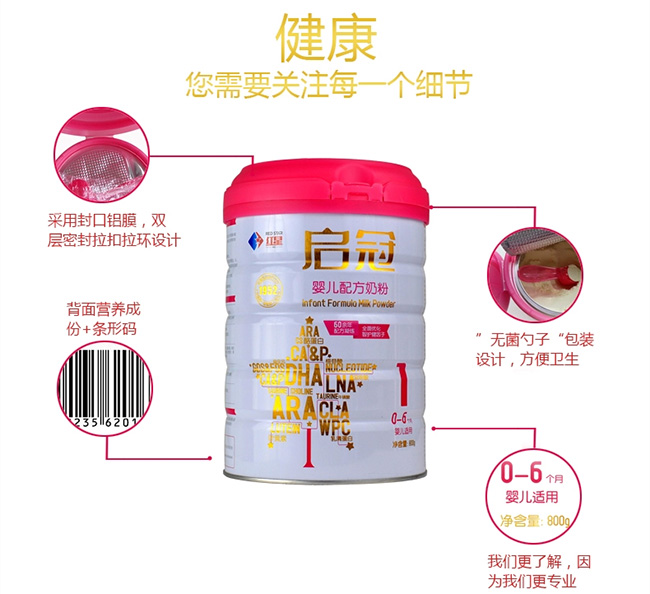 均衡營(yíng)養(yǎng),消化是關(guān)鍵。 0-6個(gè)月是寶貝一生中成長(zhǎng)最快的階段,此時(shí)寶貝的腸胃消化系統(tǒng)還很柔弱,保證營(yíng)養(yǎng)的易消化吸收非常重要。紅星采用母乳營(yíng)養(yǎng)配比結(jié)構(gòu),讓寶貝輕松消化,營(yíng)養(yǎng)快吸收。 紅星啟冠,專為0-6個(gè)月中國(guó)寶寶科學(xué)研制的嬰兒配方奶粉: 優(yōu)化多種益生元組合(GOS\FOS),有助提高寶寶腸道吸收; 營(yíng)養(yǎng)學(xué)推薦比例DHA、ARA配比,促進(jìn)寶寶智力和記憶力發(fā)育; 適宜的鈣磷(Ca&P)配比,促進(jìn)鈣質(zhì)好吸收,促進(jìn)寶寶骨骼發(fā)育; 優(yōu)化α-乳清蛋白和β-酪蛋白配比,提升18%; 高品質(zhì)α-亞麻酸,促進(jìn)寶寶組織細(xì)胞發(fā)育。 |