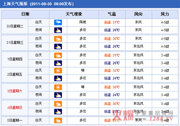 為期四天的2011中國(上海)國際孕嬰童用品展覽會(huì)展出時(shí)間,除了關(guān)注展會(huì)上的情況之外,還要注意一下上海這幾天的天氣變化情況,以下是上海未來一周的天氣情況: