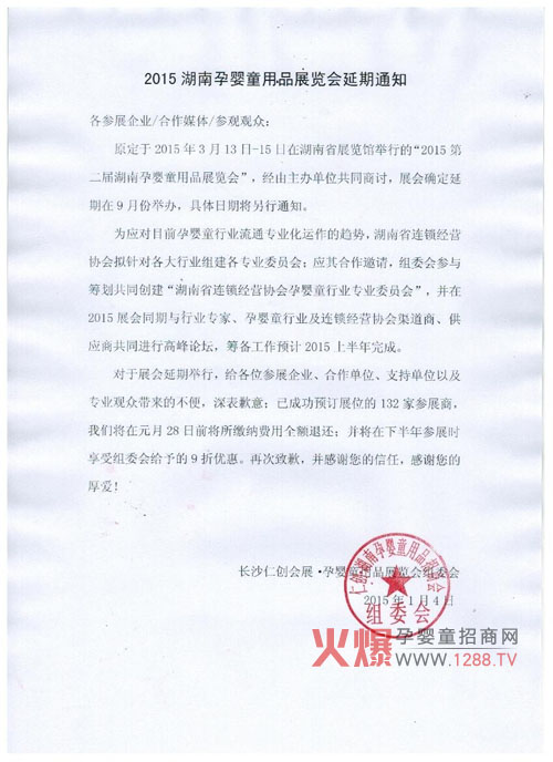 原定于2015年3月13日-15日在湖南展覽館舉行的“2015第二屆湖南孕嬰童用品展覽會”,經由主辦單位共同商討,展會確定延期在9月份舉辦,具體日期將另 行通知。